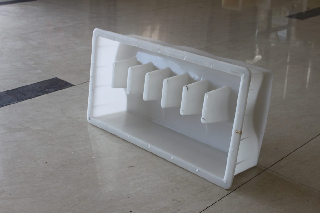 路牙石塑料模具整體外觀為長方形結(jié)構(gòu),因其尺寸較大,在模具的周邊及底部分別做了加強筋設(shè)計以保證在實際水泥路牙石澆筑過程中的穩(wěn)定性。從模具內(nèi)部的結(jié)構(gòu)我們可以看出,塑料路牙石模具主要采用了S型坡面設(shè)計,六個塑料堵頭,即所制水泥路牙石的六個排水孔,實際應(yīng)用較多的道路段為易積水或地理位置較低區(qū)域。