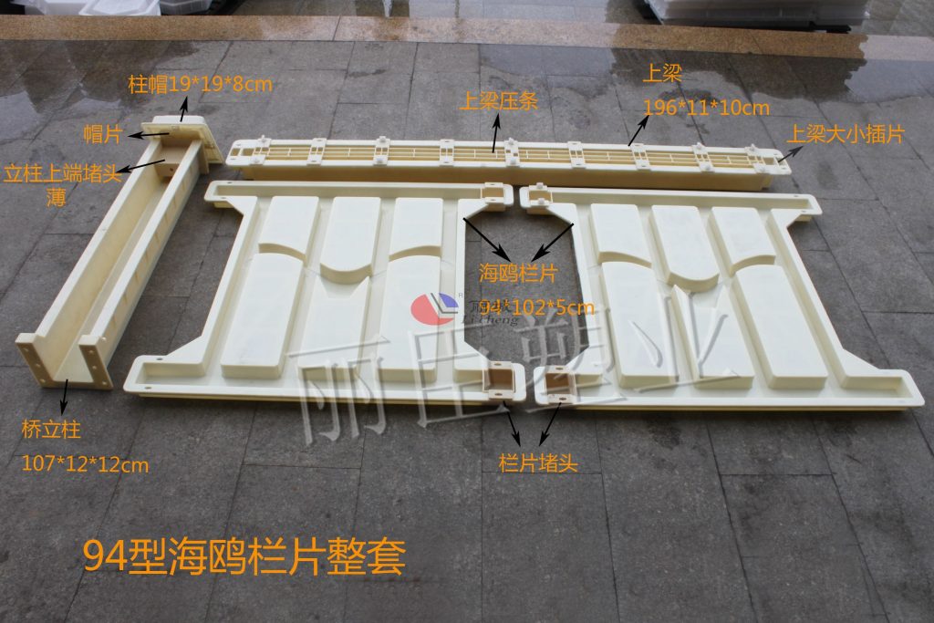 一、欄片花紋不同:那最明顯的來說便是94型護欄塑料模具在欄片的規(guī)格上進行增加,尺寸為94*102*5cm,在圖案上也進行略微的加工,采用較為生動的海鷗樣式為主要使用圖型。而72型護欄模具在尺寸上為72*91*5cm為主,圖案以工字型為主。72型整體欄片有AB之分,而94型整體欄片中沒有AB片的區(qū)分,在工程使用中也不用擔(dān)心欄片裝反的情況發(fā)生。