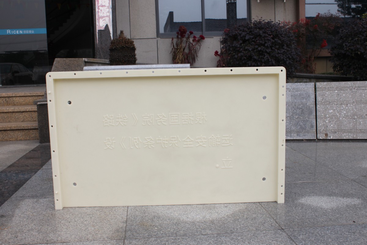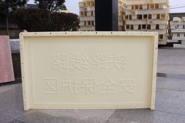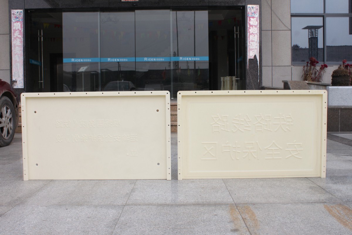 標識牌塑料模具主要的結構為2快拼合而成。標識牌總共分為2個部分:一面印有“國家鐵路安全線路保護區”字樣,另一面為“根據國務院《鐵路安全運輸保護條例》設立”字樣。此水泥警示牌模具為國家中鐵局定制,任何企業及個人制造都需國家鐵路局授權許可才可制造生產。