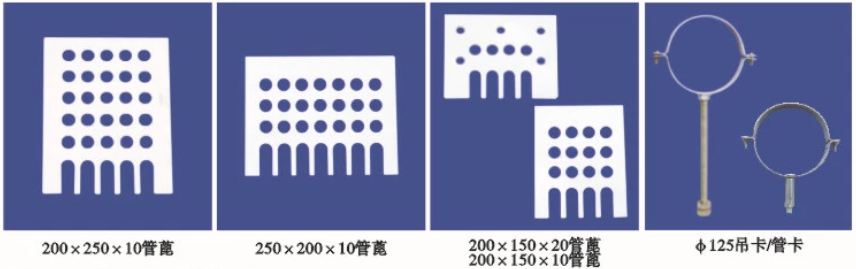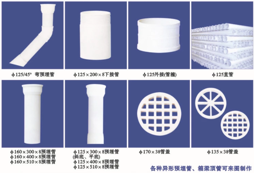 Φ125/90°彎頭,Φ125/90°帶口彎頭,Φ125/90°帶疏通正角彎頭,Φ125三通,Φ125帶疏通三通,Φ125/45°彎管,Φ125/15°彎管,Φ125/45°彎預埋管,Φ125*200*8下接管,Φ125外接管箍,Φ125直管,Φ160*300*8、Φ160*400*8、Φ160*510*8預埋管,Φ125*300*8斜底、平地預埋管,Φ125*400*8、Φ125*510*8預埋管,Φ170*38管蓋,Φ135*38管蓋,200*250*10管篦,250*200*10管篦,200*150*10、200*150*20管篦及Φ125吊卡管卡等多種配件。
